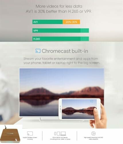 - Support AV1 encoded and 4K HDR content, enjoying the fantastic video viewing experience. More bright-coloured video for less data, save 20%-30%. Support mouse and keyboard via USB; Support 2.4 G wireless mouse and keyboard via 2.4 G USB dongle