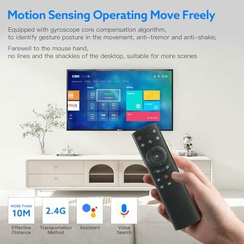 This remote control features voice search, analog cursor, 2.4G wireless transmission, plug and play design, and compatibility with Android systems. It has 18 keys, 6-axis gyroscope sensors, and a range of over 10m. The package includes a remote control and USB receiver.