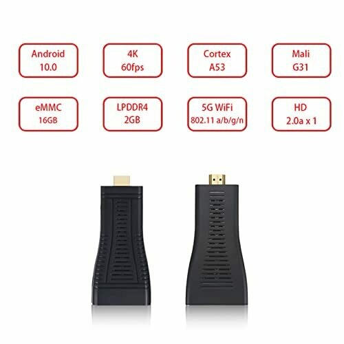 New Android 10.0 smart TV stick: Mini android computer stick, built in dual WiFi 2.4G 5.8G 802.11 b/g/n AC and Bluetooth 4.0. Faster boot: This android streaming TV stick is Allwinner H313 Quad Core ARM Cortex A53, 2GB RAM + 16GB ROM. Support HDR, 4K UHD: The mini PC TV support 4K and 3D Movies. Enjoy your home theater: The smart WiFi stick lets you play videos, music and photos from your smart phone or tablet computer on your TV, enjoy them on the big screen and best speaker. What you get: 1 x Android 10.0 TV Stick, 1 x Remote control, 1 x IR Extend Cable, 1 x HD Cable, 1 x User Manual.