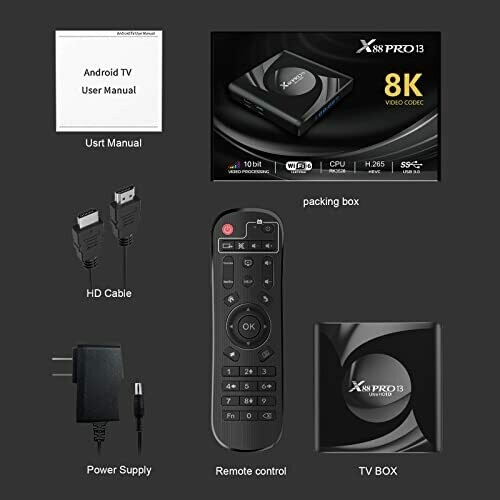 • X88 PRO13 TV Box Android 12.0 adpots 4GB DDRIII + 64GB EMMC Flash, 4GB Memory guarantee fast running speed and stable operation, the 64GB internal storage ensure plenty space and freedom to install apps, games, movies, etc.