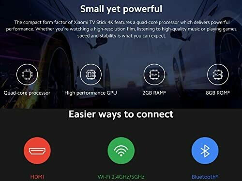 • Small yet powerful: the compact form factor of Xiaomi TV Stick 4K features a quad-core processor which delivers powerful performance. Whether you're watching a high-resolution film, listening to high-quality music or playing games, speed and stability is what you can expect.