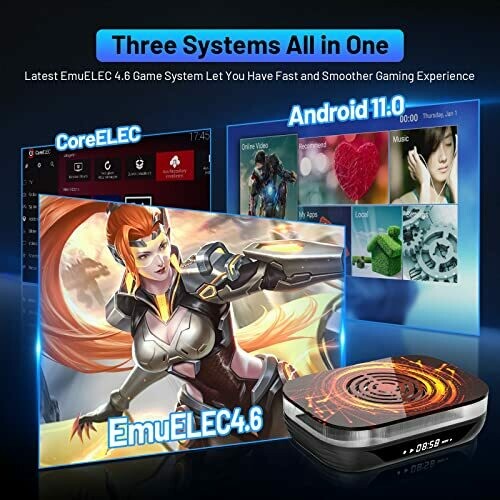 • Three Systems in One: The Kinhank Super Console X4 Plus features Android TV 11.0, EmuELEC 4.6 game system, and CoreE audio system, allowing you to play games, watch TV, browse the web, and switch easily, enhancing your entertainment experience.