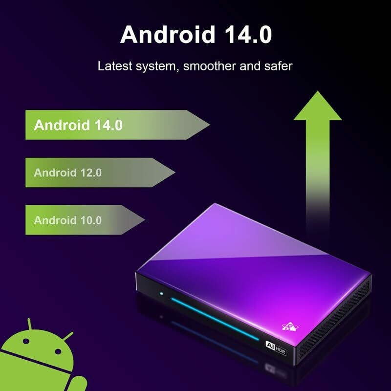 • The newest Android TV box adopts Android 14.0 OS and an updated RK3576 quad-core processor, bringing a fresh design and new features to you. Android 14.0 runs faster than Android 13.0 and improves compatibility with applications. The built-in Mali-G31 GPU is far ahead in image processing, ensuring seamless video playback.